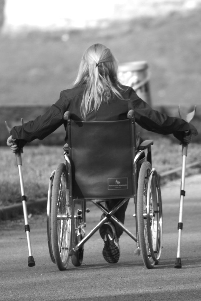 i oqui vedo un b/n un po spento euno sfondo poco curato(vedi bruciatura nella parte superiore del fotogramma e quello che pare essere un cestino frontalmente alla ragazza)...in generale nella street ci vuole coraggio e quindi un inquadratura alle spalle non è il massimo...ma qui v è sicuramente una questione di privacy e rispetto nei confronti della giovane(credo degente in una qualche struttura sanitaria..forse dove tu lavori?)e lo sguardo si sofferma ad osservare la menomazione fisica (ma potrebbe pure non essere una amputazione ma soltanto chessò un arto in trazione...)che insieme al titolo potrebbe(dovrebbe o forse lo fa)scuotere chi osserva...