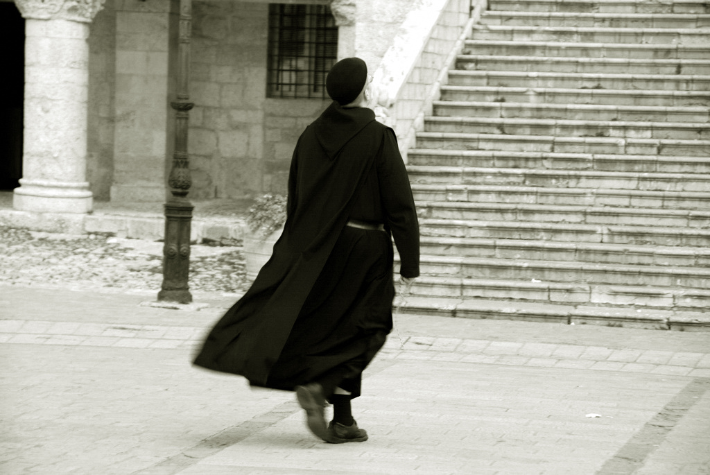 bello il micromosso che sfuma verso il movimento del piede, del saio che svolazza e del rosario che ondeggia. avendo limitato la pdc (hai usato il tele?) si stacca bene dallo sfondo.