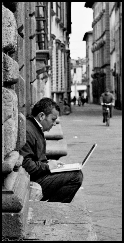 Lo scatto propone un'interessante chiave di lettura basata sulla contrapposizione tra il moderno e l'antico, o per dirla diversamente sul modo di vivere di oggi e su quello di ieri. Il portatile dell'uomo in primo piano e la biciletta sullo sfondo esprimono bene questi due concetti. Anche a voler trascurare questo legame il momento resta valido, e lo scatto è in grado di parlare delle abitudini di vita del momento. Nessuna riserva sul contenuto e sul momento quindi, mentre ne ho qualcuna sul taglio, che trovo un po' troppo stretto ed il cui sviluppo in verticale non mi sembra del tutto giustificato se partiamo dal presupposto che i principali centri di interesse sono collocati in basso.