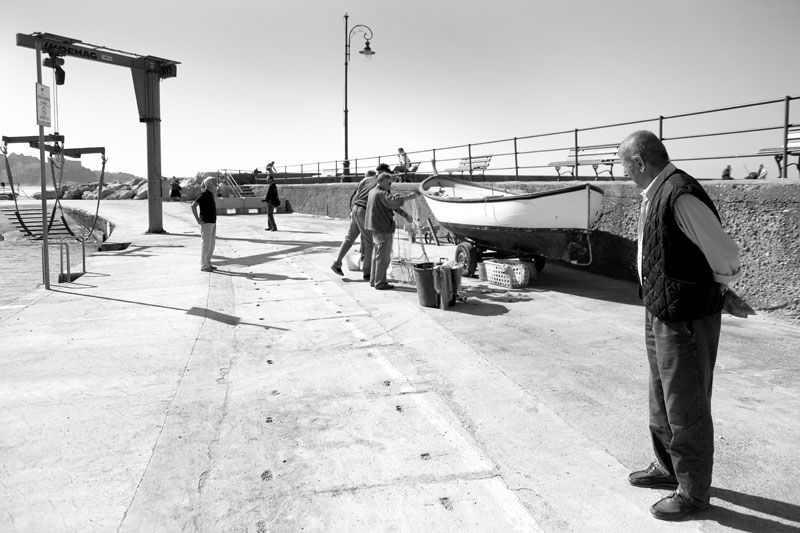 Il momento colto, pur nella sua semplicita', non appare affatto banale. In particolare la posa del signore, con quelle mani dietro la schiena, risulta cosi' eloquente da rappresentare praticamente uno stereotipo della postura assunta da chi, senza andare di fretta, si soffermi ad osservare lo svolgersi di un lavoro per strada. La sua posizione nell'inquadratura (pur 'obbligandoci' ad una lettura dell'immagine dx ->sx), guida naturalmente lo sguardo dell'osservatore verso la scena che si svolge intorno alla barca. In secondo piano, la presenza di una seconda persona che sta seguendo la stessa scena, conferisce una certa simmetria ed equilibrio alla composizione. Gli elementi a sx di questa seconda persona (la struttura tipo gru) potrebbero a mio parere essere anche esclusi dall'inquadratura, non aggiungendo niente di significatico al contenuto.