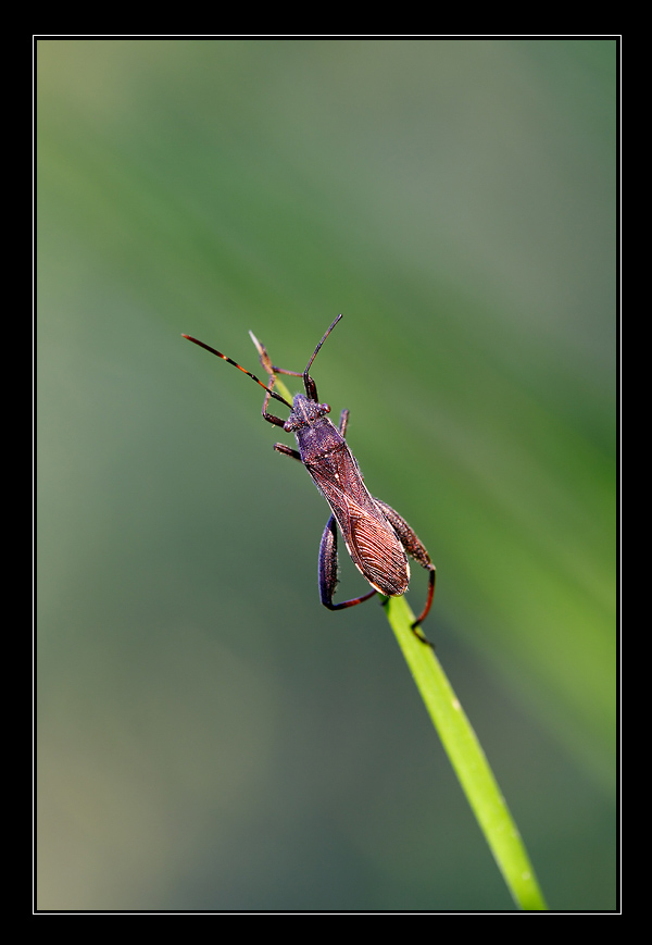 Per me la compo centrale calza a pennello: la vista dall'alto, la minuscola e precaria passerella, l'insicura avanzata delle zampette, la voragine verde 100 metri più sotto... tutto sembra dare l'idea di un precario equilibrio che contrasta bene con la staticità della composizione centrale.