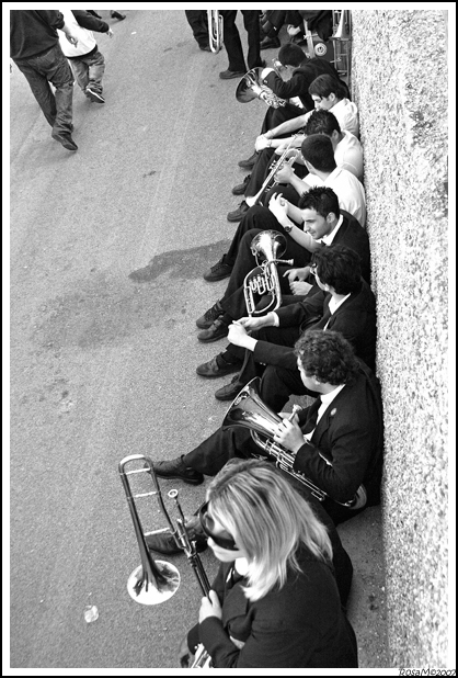 Interessante il punto di ripresa e la composizione che sembra ricercare un approccio idoneo a disporre gli elementi figurativi lungo linee di forza ben definite. Il muro, la linea sull'asfalto, l'altra diagonale lungo la quale sono allineati i suonatori seduti, suggeriscono il percorso che dovrà seguire lo sguardo. Lungo il percorso si incontrano alcune interruzioni: la donna in primo piano guarda non si sa cosa, le macchie al centro della scena interrompono il motivo quasi geometrico formato dalle linee di cui sopra, i passanti nell'angolo in alto chiudono bene l'impianto tonale, meno bene l'armonia delle forme.