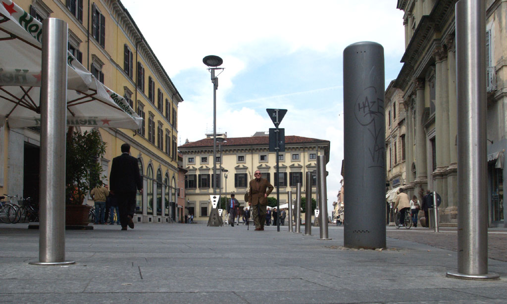 Il punto di ripresa dal basso enfatizza indubbiamente la presenza e le dimensioni apparenti dei pali, ma, al di la' di questo effetto prospettico la foto risulta un po' vuota e non riesce a raccontare molto, a parte mettere in evidenza elementi di arredo urbano dal gusto estetico discutibile. La persona col bastone che sopraggiunge, e che probabilmente nelle intenzioni dell'autore avrebbe dovuto essere il protagonista di un racconto, risulta troppo lontano e si confonde con il resto della scena. Soprattutto non si nota alcun effetto che possa ricordare uno slalom tra i pali....