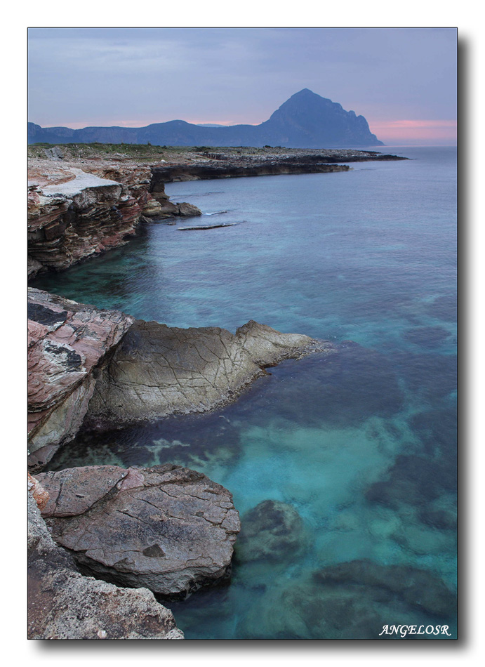 l'occhio segue le roccie dal basso fino a iungere al monte in alto e si perde nelle sfumature rosa del cielo....