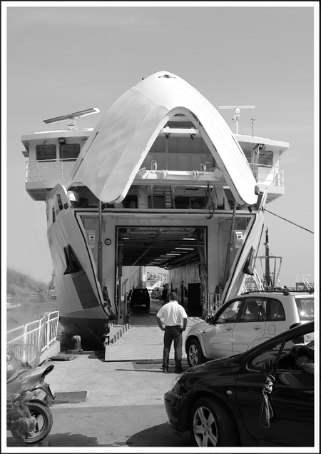 Le geometrie della nave riempiono bene la parte centrale del fotogramma, il motorino in basso a sinistra avrei cercato di eliminarlo, anche se dal punto divista tonale chiude bene. Lo scatto sembra più documentare l'imbarco, facendo leva sul tratto compositivo, piuttosto che soffermarsi su di un particolare o una storia che intorno a quella nave si stava svolgendo. La resa del B&N è piuttosto morbida in tutto il fotogramma (non è un difetto sia chiaro), ma la sovraesposizione di parte della nave attira un po' (troppo) l'attenzione e altera l'equilibrio tonale.