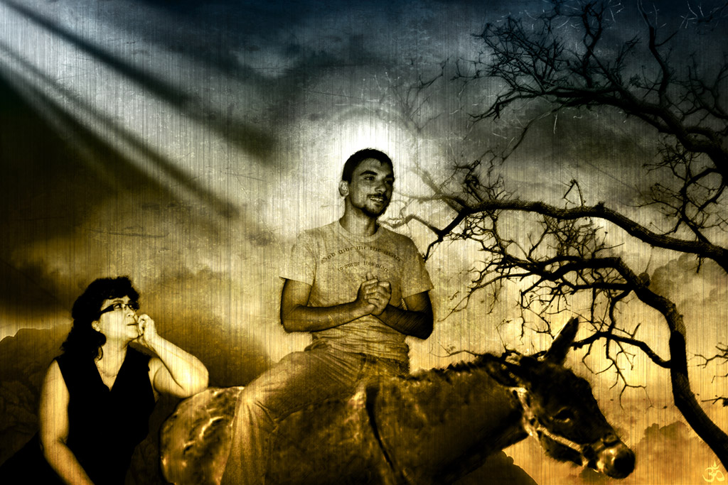 Simpatica elaborazione per questa coppia(mamma & figlio) di miei familiari, esasperazione di un concetto/sfottò che è un classico in famiglie con più figli (il figlio preferito...prossimo alla santità).... la foto in questione è stata regalata a natale alla mamma ritratta in formato panoramico su carta kodak.
