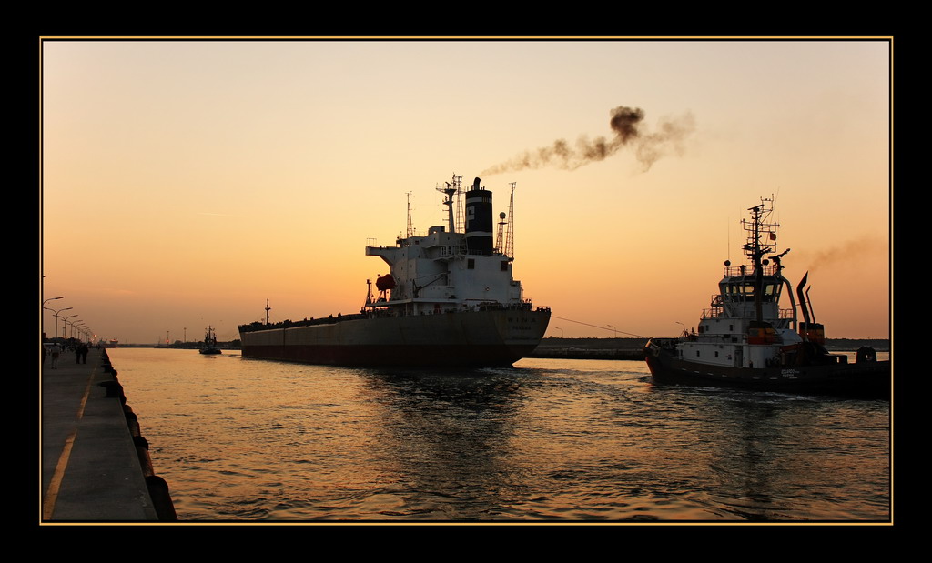 la prima postata è suggestiva perchè c'è la "vita" (sbuffo di fumo) della nave trainata..il tramonto ha lasciato il posto a dei colori atmosferici molto riposanti..mannaggia la mancata inclusione del rimorchiatore, forse a questo proposito potevi evitare di riprendere anche parte del molo...sicuramente era importante per sentire la presenza della teraferma ma così hai rovinato la forte presenza del rimorchiatore..il filo giallo sulla cornice è coerente con il tramonto ma personalmente preferisco preferisco il bianco..  _________________ Un giorno senza swing è un giorno perso. Canon 30D--Canon Zoom 17-85 IS USM F4-5.6, 70-300 IS USM F4-5.6 - Lumix Lx-1. |