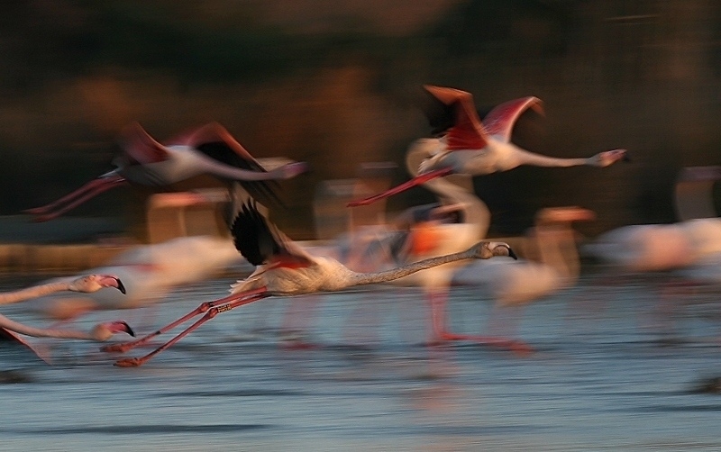 Ti ringrazio invece per la tua sincerità: mi offre uno spunto di riflessione. Dal mio punto di vista il movimento è calibrato su tre piani distinti: il fenicottero in volo più vicino, reso quasi immobile dal panning centrato su di lui; i due mossi, ma ancora distinguibili che segnano il secondo piano spaziale e le sagome appena percettibili e disordinate di quelli sullo sfondo in piedi: tre piani segnati da differenti livelli di mosso e/o sfocato. Questo, ripeto, era il mio punto di vista, ma potrei senz'altro sbagliare.
