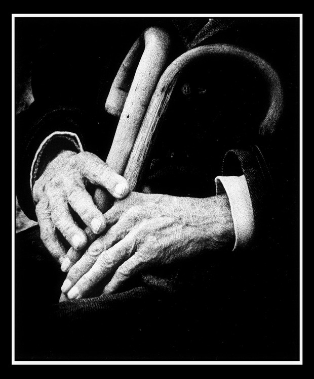 cito Marco perchè questa immagine mi rimanda in modo prepotente alla musica: le curve dei bastoni e la posa delle mani richiamano un grande strumento a corda, che so, un violoncello, ed i segni del tempo sulle concordi mani testimoniano che la persona ha dato molto nella sua vita; partendo da queste considerazioni farei un titolo del tipo Accordo in chiave di do... che ne pensi?