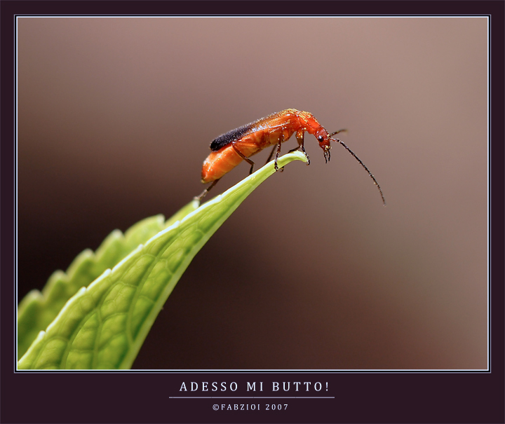 Che dire .... anche questa foto pare che vi sia piaciuta, terrò in considerazione i consigli ricevuti, però bisogna anche dire che l'insettino fotografato è uno psicopatico non sta mai fermo e cercare di averlo a fuoco tutto è impresa difficile, per la luce è questione di gusti effettivamente è un pochino dura ma secondo voi sarebbe stata più interessante con una luce morbida, a mio giudizio no perchè una luce morbida avrebbe fatto apparire la decisione da prendere "mi butto o no?" meno drammatica, con un impatto visivo meno attraente  |