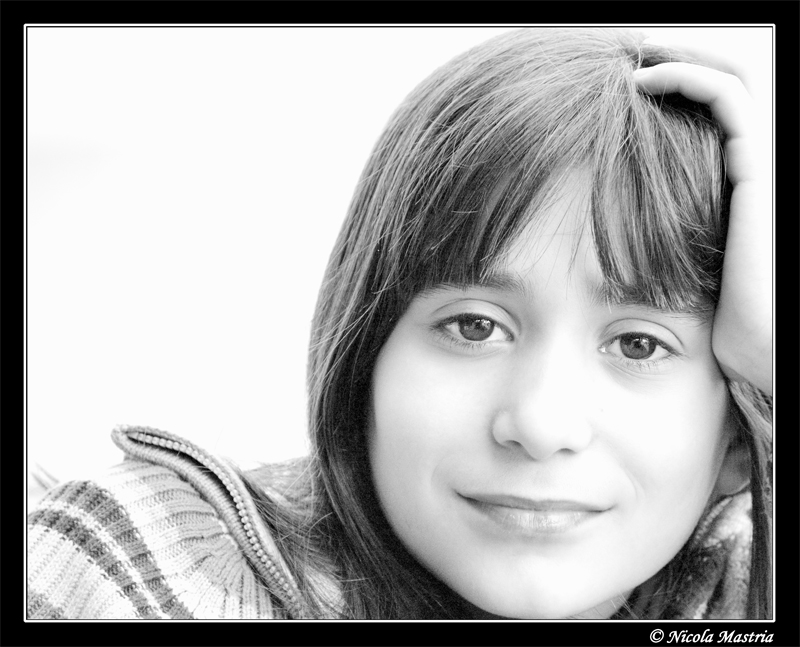 Non ho mai fatto il b/n. Cmq mi piacciono i toni morbidi del viso ed il taglio dell'immagine. Mi piace poco la cornice, peccato veniale.