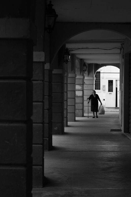 Buon ala profoindità data dal susseguirsi delle colonne che conducono versa l'anziana signora che avanza a fatica...