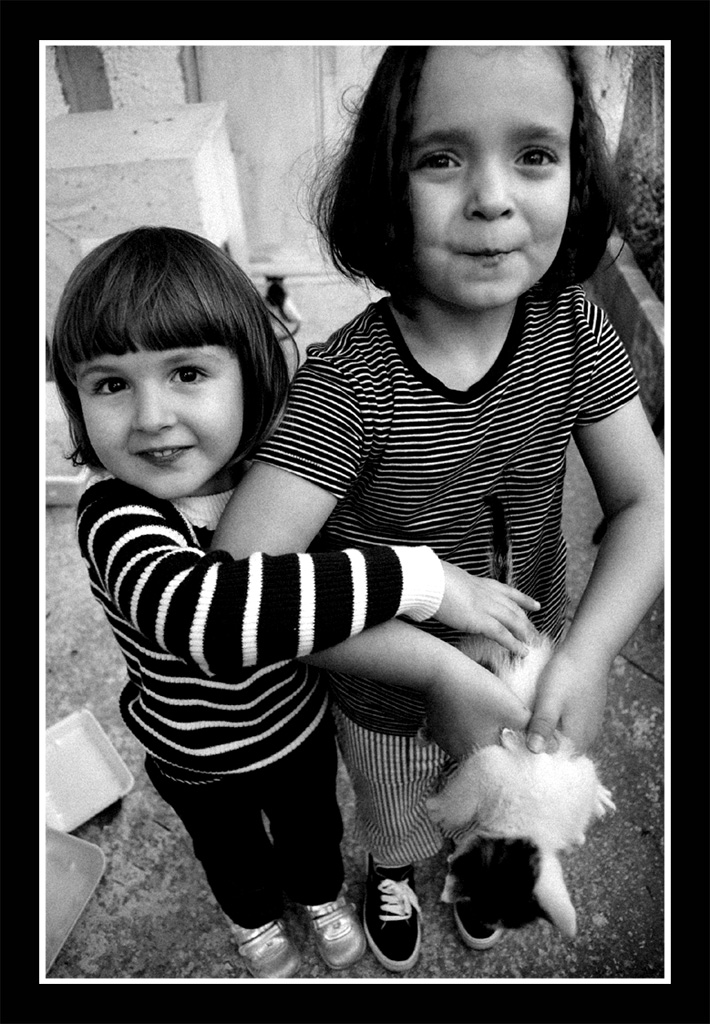 bello il fatto che le due bimbe abbiano vestiti a righe rispettivamente orizzontali e verticali le staglia molto bene l'un l'altra.