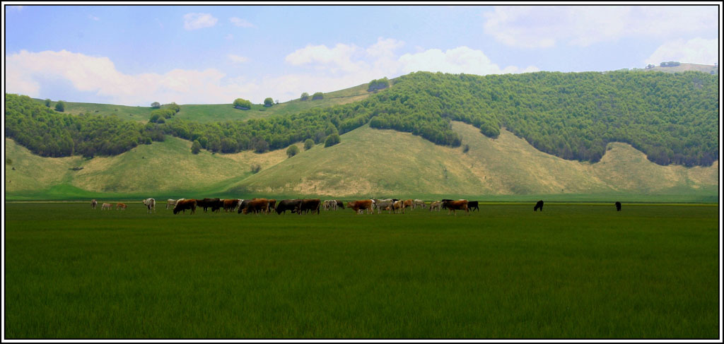 Belo il contrasto tra il verde cosi' intenso costellato dalle mucche scure e lo sfondo leggermente appannato dalla foscia....