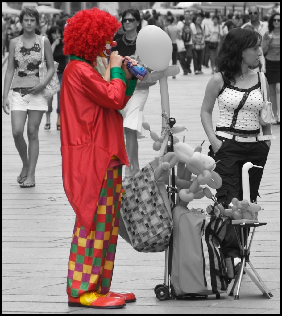 io avrei lasciato a colori anke le "attrezzature" del clown (un pezzettino della borsa minuscolo infatti ci è scappato!) proprio per amplificare questo contrasto tra due mondi:quello di sorrisi,colori,palloncini e quello del grigio abitudinario..