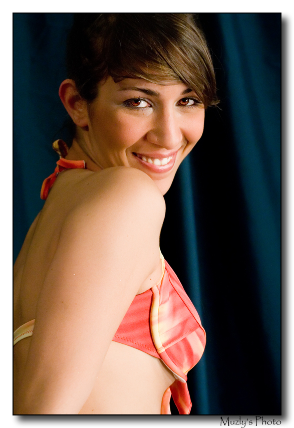 Bella espressione naturale.. però vado sul pignolo.. io l'esposizione la trovo corretta..però effettivamente gli occhi sembrano un po' innaturali.. ma si possono sempre scurire leggermente... quello che non mi piace è il costume non messo bene sul seno che provoca quelle pieghe non uniformi.. la ciocca dietro il collo.. e il mento troppo infossato dietro la spalla, un po' meno non avrebbe guastato.. in ogni caso resta una bella immagine.