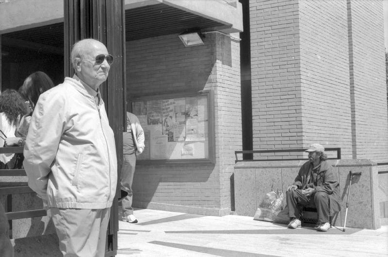 La foto risulta essere molto chiara, non mi piace la gestione del b/n, se fossi riuscito ad inquadrare leggermente più a dx saresti riuscito a scoprire l'uomo dietro la colonna e li potevi creare una triangolazione tra i personaggi anche perchè il mendicante guardava in quella direzione.