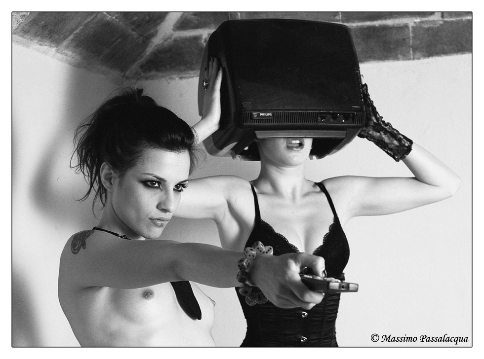 Qui la azione è vista in diagonale.... la Gervasi non fissa l'osservatore... non gli rivolge il telecomando direttamente contro come un'arma.......in questo senso, anche se le luci sono più forti, la pulizia formale è innegabile e la composizione è più ortodossa rispetto a quella di Stecco......