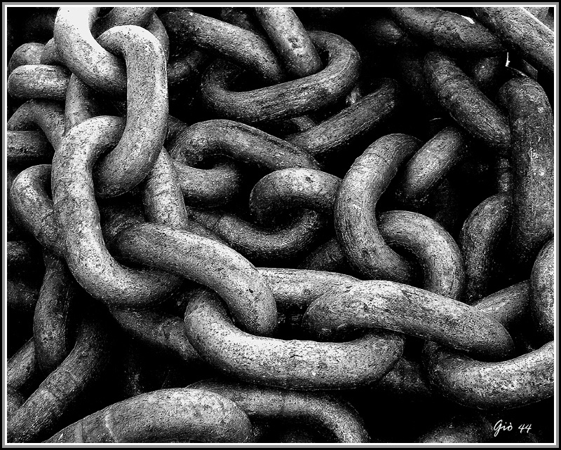 Il taglio stretto decontestualizza, comprime il contorto gioco degli anelli entro un indifferente campo quadrato e questo contribuisce ad astrarre la schietta figuratività della catena.