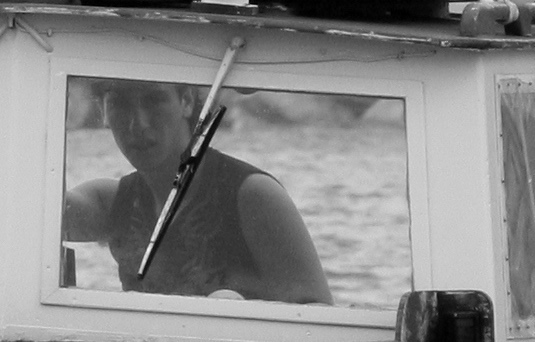 immagine troppo piccola per una buona lettura! Comunque non mi sembra particolarmente riuscita. L'idea era buona, utilizzare l'oblo' della barca come cornice peccato che ci sia quel tergicristallo proprio davanti al soggetto e che, oltrettutto il fuoco sia andato su di esso. Disturba un po' anche il pezzo in basso che spunta. B/W troppo grigio e piatto! Smile