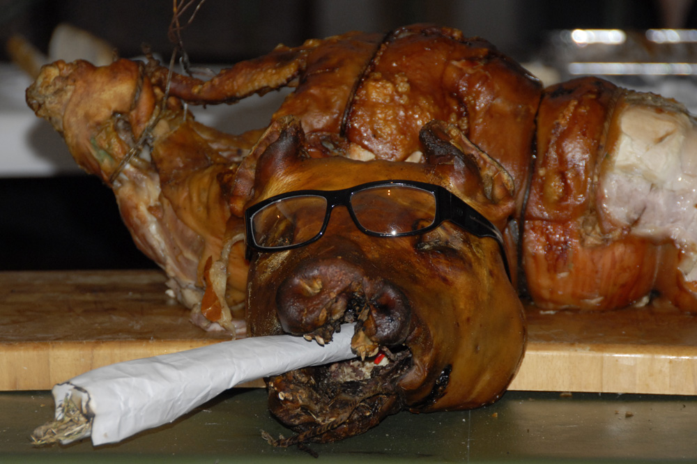 Passavo davanti ad un venditore di panini con porchetta che ha pensato di "decorare" in tal modo il defunto animale.