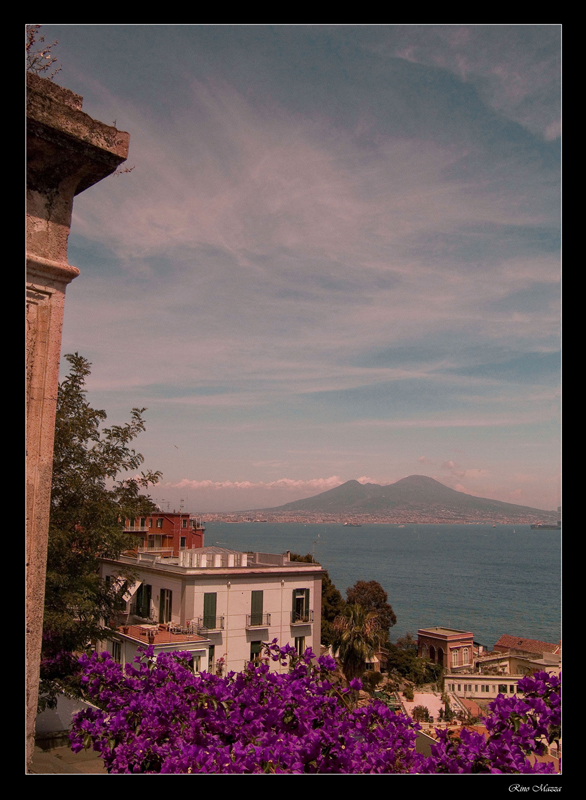 Il cielo con quelle sfumatura rosee che vengono richiamate ed accentuate dalla cornice di fiori in basso sono una meraviglia e la città piu' dietro e il vesuvio in lontananza ci riportano tutto il fascino di Napoli.