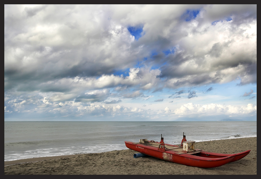 Gran bella composizione...un'atmosfera tendente al grigio con un richiamo vivace attraverso il rosso dell'imbarcazione...