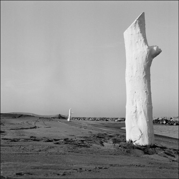 due monoliti, bianchi, imponenti, non spettri né fantasmi, piuttosto due forti e sagge presenze, ad indicare il mare, la via e l'andare...la ricerca di ancora nuovi mondi...là dove gli occhi non arrivano e dove il pensiero e la ricerca approdano...intorno solo una distesa di sabbia e qualche scoglio...