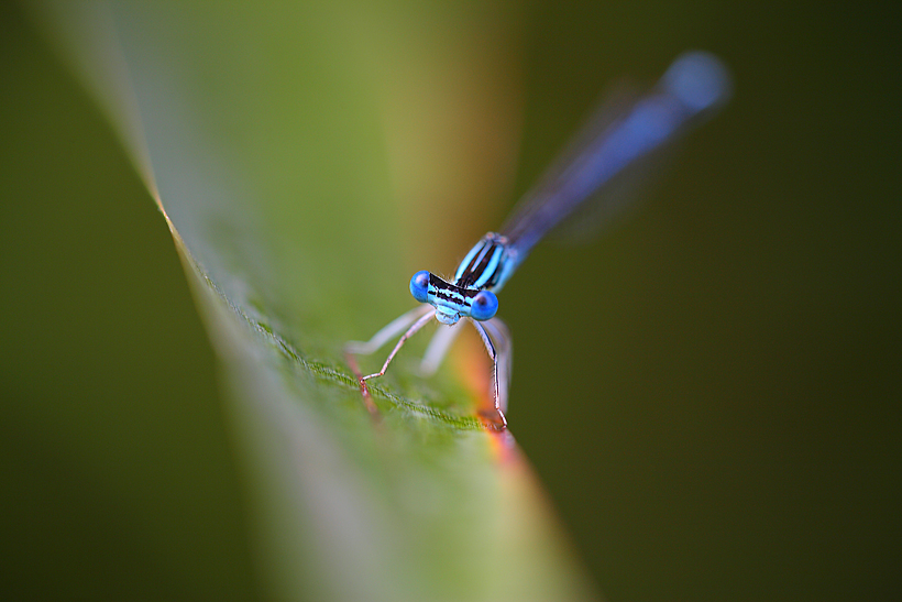La padronanza della maf selettiva conferisce all'immagine una notevole dinamicità. La libellula appare come una figura dei cartoons che scivolando sull'acqua frena all'improvviso. Molto bello l'azzurro della testa. Come sempre bravo Oh yeah!