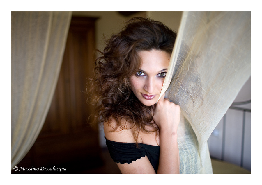 Poi, cominci a notare altri particolari......i capelli sono quasi arrabbiati, volano in ricci ribelli e le punte sono arrossate da strani bagliori......anche la tenda è di un giallo pallido.... ma fra le maglie del tessuto si accendono fasce aranciate di colore....la mano destra stringe la stoffa e quasi si confonde lattea sul tessuto....morbida....... ma il viso è nitidissimo, i linementi taglienti, quasi portatori di una strana minaccia..... è come vedere una Maga Circe che cerca di catturare le sue prede......per farne materia di stregoneria.......