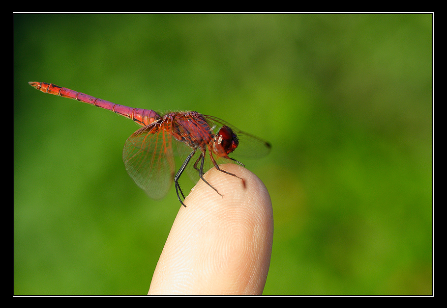 Ohhhhh!!! Ma come hai fatto??? Le libellule non sono mica come le farflle, sono molto più sospettose e diffidenti! Che bello scatto e che bell'emozione! Tra l'altro, a parte il dito un po' chiaro, è una foto fantastica!!!