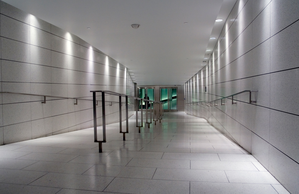 mi piace moltissimo sia la composizione che la gestione del colore che l'immagine in sè..... visto il titolo ed il tipo di effetto forse se fosse stato possibile fare partire dai quattro angoli del rettangolo della foto le quattro linee degli spigoli del corridoio sarebbe stata una vera chicca...