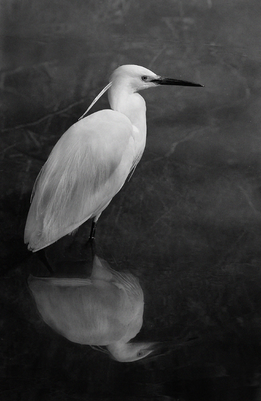 una garzetta in penombra col suo riflesso..quasi un fantasma nascosto nello specchio (d'acqua)