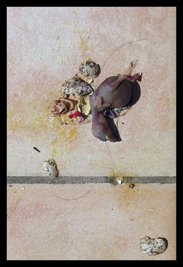 Stupisce anche la fortuita o voluta presenza di quel che mi pare un fiore caduto tra i resti dell'uovo.
