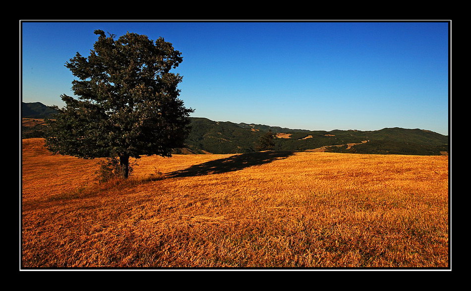 La forma reale dell'albero si allarga in orizzontale...( ma poco.. il gioiellino lavora bene..... ).... l'ombra dello stesso si allunga in verticale....e va a cadere oltre la curva del pendio.... scivolando dolcemente sull'oro del terreno, puntando al verde delle colline....... il cielo è sereno, senza una nuvola, impassibile e quasi freddo e lascia placido al protagonista tutta la scena...... c'è una malinconia solo accennata ma palpabile in questa foto.... la luce è vivida ma calante...... è la maturità del giorno che già si consuma e preannucia il suo spegnersi in quell'ombra.......