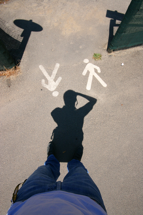 Che buona idea: l'ombra che fotografa i simboli pedonali! Mi piace, anche se avrei tagliato un po' di panza in fondo
