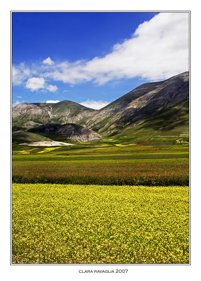 Dall'anteprima, avevo riconosciuto questa magica distesa di colori come un'ottima distesa di colori.. e non so perchè, l'avevo accostati al tuo nome.. aprendola sono esplosi in questa splendida immagine.. un tripudio di bei colori, giallo, rossastro, poi verde, poi quello delle rocce, e quel bel cielo azzurro, imbiancato dalle nuvole, che chiude questa bella immagine.. Davvero particolari le ombre delle nuvole sul terreno..