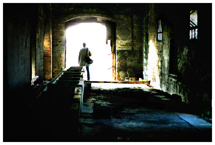 Mi fa pensare ad un qualche percorso, che dopo tante difficoltà (rappresentate dai tanti oggetti presenti), sia arrivato ad una svolta, ad una conclusione, verso una luce che porta in una nuova dimensione..