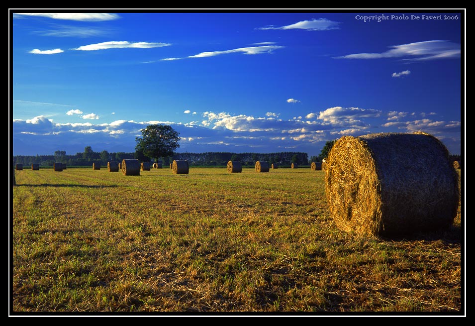 Bella la luce calda degli ultimi attimi prima del tramonto, che si spande su questa terra e su questa campagna, illuminando tutte queste rotoballe, quella in primo piano è illuminata davvero in maniera ottimale..