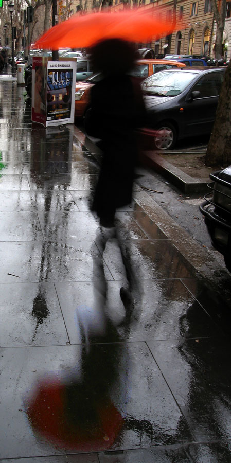 La definizione del bagnato contrapposto sl mosso del passante rende un'immagine molto gradevole; io, ma è solo gursto personale, avrei reso l'immagine meno concentrata sul riflesso tagliando la parte bassa....ma....ripeto....solo gusto personale. Ok!