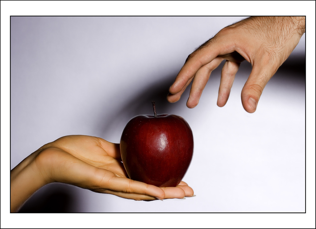 gli elementi della foto direi che sono tutti funzionali: lo sfumato dello sfondo è per completare la composizione diagonale in senso opposto alle mani, la mela rossa molto saturata e accattivante, la mano della donna in segno d'offerta e le ombre molto marcate e poco still life come a presagire una presenza oscura dietro al gesto