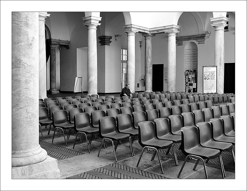 un po' meno luce forse (e meno contrasto) gioverebbe all'idea di solitudine. sembra una solitudine "temporanea" come uno che è arrivato in anticipo alle cresime. ci vedrei pure una bella vignettatura
