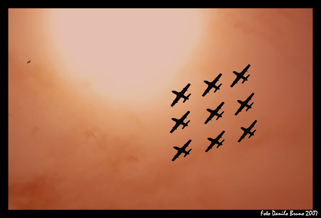 foto scattata nei cieli di Siracusa durante un'esibizione delle frecce tricolori.Dopo un giro di contrasti-saturazini-regola colore con photosshop.....è venuto fuori questo! buon modo per mascherare un controluce cosi' forte!!!!