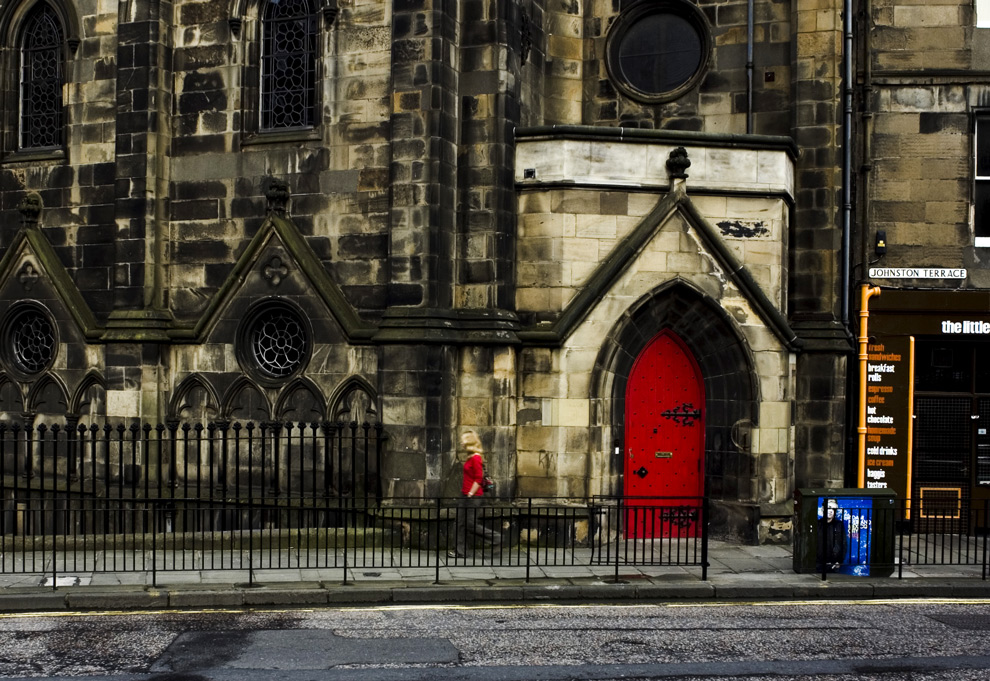 Mi piace , le tonalità sono molto particolari, forse avrei tagliato in alto all'altezza della fine del casotto della porta per concetrare lo sguardo più sul rosso e per dare più dinamicità al movimento della donna.