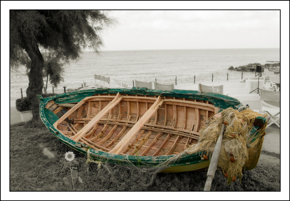 bellissima foto, mi piace molto l'aver lasciato quel verdone scrostato della barca ed il giallore della rete che si interlaccia al legno della carena...poi quel fiore in b/n là sotto è una delizia; e spicca più che mai nel notarlo, che i colori bleffano e deliziano anche quando non ci sono! bravo