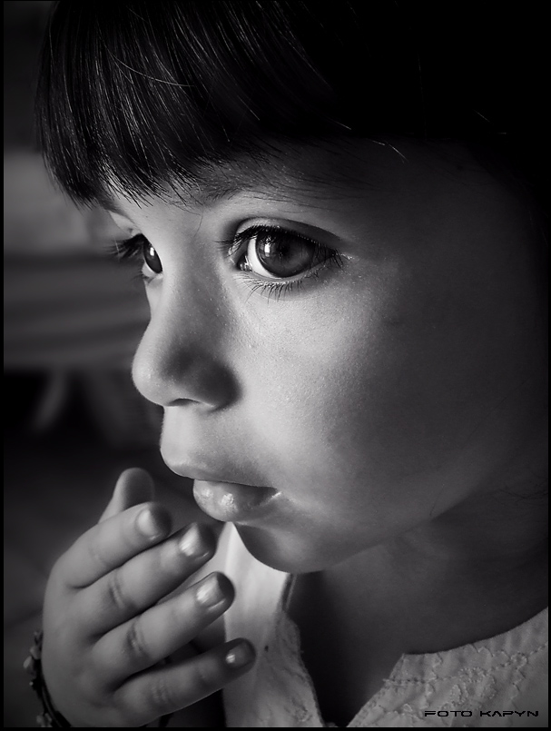 Sapiente gestione del B&W. I tono riprodotti e l'ottima gestione della luce trasmettono immediatamente lo stato d'animo della bimba, il mosso della mano rende l'immagine dinamica, viva, facendoci provare anche a noi lo stupore da lei vissuto in prima persona.Un'immagine assolutamente non plastica come si poteva rishiare di ottenere.Definizione al top per un'immagine semplice e pulita, non per questo banale, anzi carica di sentimento. Solo lo sfondo poteva essere più omogeneo,tanto per non distrarre l'attenzione.
