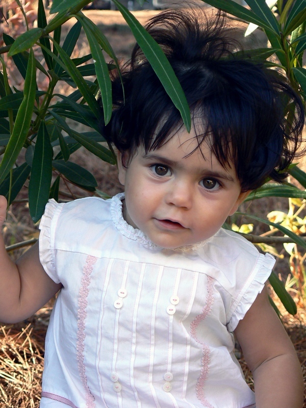 Un ritratto piacevolissimo che non può che strapparci un sorriso di disarmante dolcezza. Bellissima l’espressione della piccola, curiosa e rapita, consapevole della posa, che occhieggia tra le lussureggianti fronde di un oleandro, con il suo brillante sguardo screziato di rame e carico di luce.