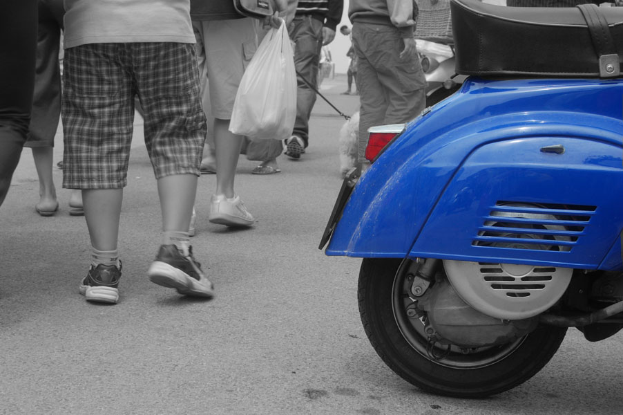 Scusa, intitoli la foto "camminando" e poi con la desaturazione parziale attiri l'attenzione sulla vespa. Come minimo c'e' un po' di confusione su quale dovrebbe essere il soggetto dell scatto