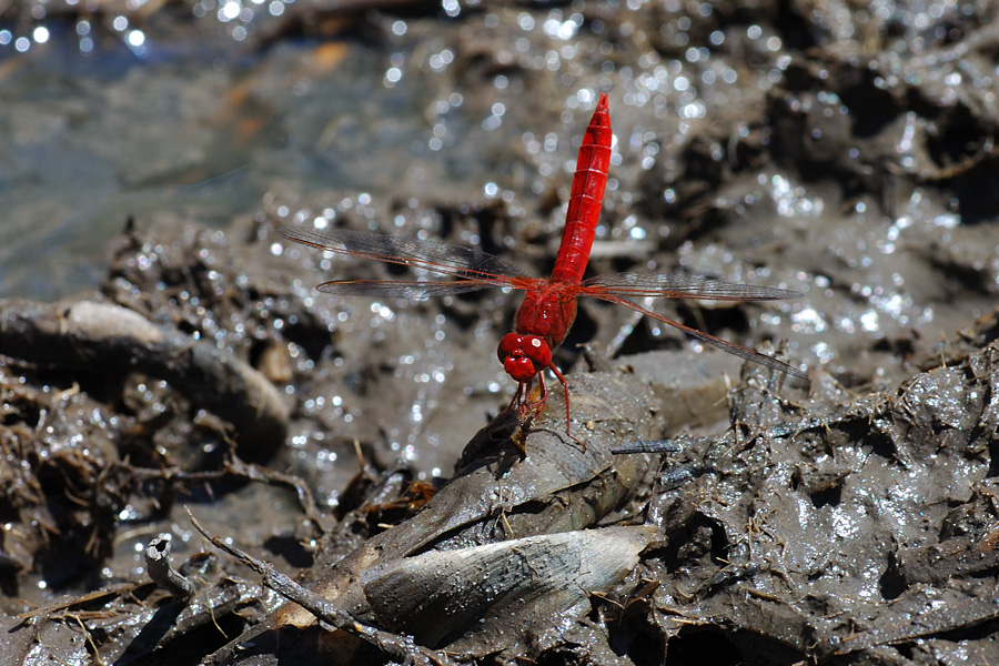 Il contrasto tra lo sfondo grigio e fangoso e la libellula rossissima a mio avviso rende lo scatto molto particolare.