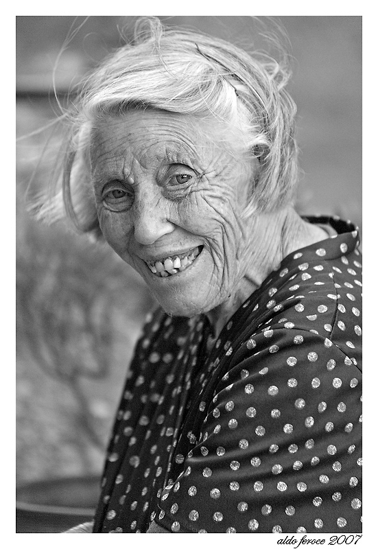 Mi piace la posa. L’anziana signora è colta lateralmente, così che si senta più forte il movimento di rotazione della testa lievemente inclinata; ...come se il soggetto si stesse girando proprio nel momento dello scatto, destato all’improvviso dai suoi intendimenti quotidiani e reagendo con quella disarmante risata che coinvolge e conferisce al ritratto una spiccata umanità.